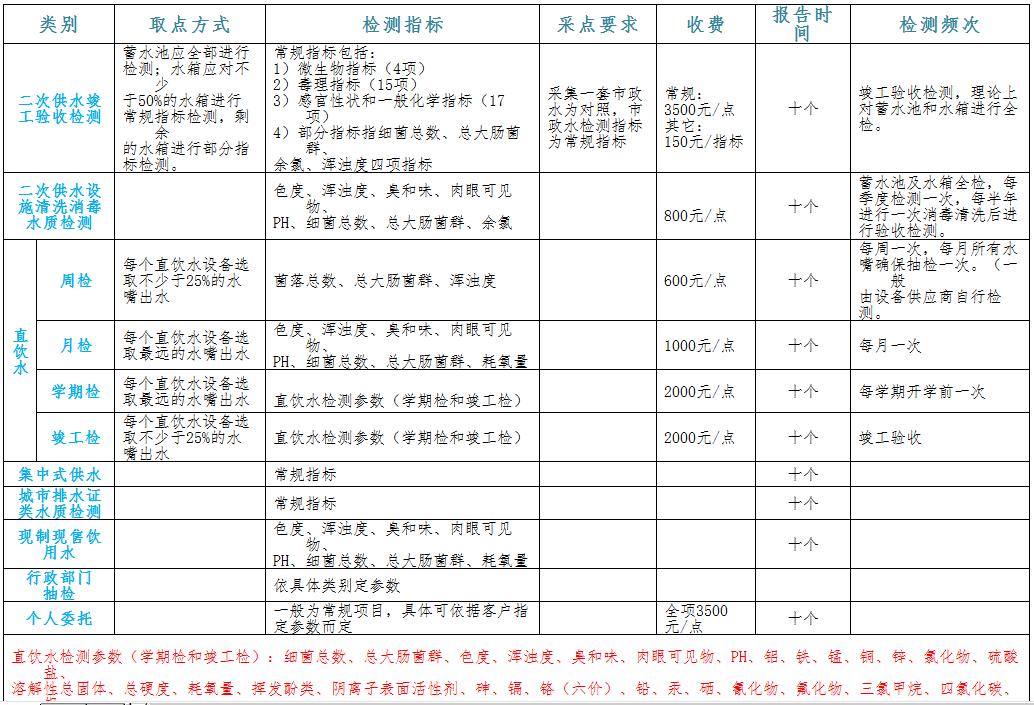 檢測項目:1色度、2渾濁度、3游離氯、4一氯胺、5臭和味*、6肉眼可見物*、7pH、8總硬度、9鋁、10鐵、11錳、12銅、13鋅、14鉛、15鎘、16硒、17揮發酚類、18陰離子合成洗滌劑、19硫酸鹽、20氯化物、21溶解性總固體、22耗氧量、23砷、24鉻(六價)、25氟化物、26汞、27硝酸鹽氮、28氰化物、29菌落總數、30總大腸菌群、31耐熱大腸菌群、32大腸埃希氏菌、33四氯化碳、34三氯甲烷、□(二氧化氯、亞氯酸鹽、氯酸鹽)、□(臭氧、甲醛、溴酸鹽)